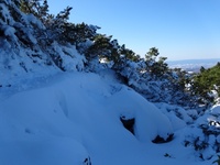 駐車場近くは岩石露出。散策路(望岳台~白銀荘)を経路としたため、九条武子歌碑近くになると這松が積雪の重みで進路を防いでいたため標高1093m、距離2.1km地点で中止。