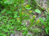 特 徴 枝分かれし、斜上する。葉は長楕円形で互生し、あらい鋸歯があり、基部は耳状に茎に付く。花は茎の先端にまとまってつく、黄色で4弁。