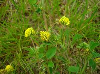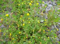 特 徴 茎は地を這い斜上する。葉は3出複葉で小葉は倒卵形、上部には細か鋸歯がある。花は葉腋から伸びた花柄に黄色の蝶形花を多数まとめてつける。