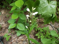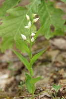 名前の由来:ギンランは花が黄金色のキンランに対比して白色(銀色)なので。 特 徴:葉は長い楕円形で、葉脈がはきりし、互生する。花は茎先に白い小さな花を数輪つける。唇弁のつけ根に短い距がある。苞は花序より高くならない。