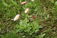 ヒナギク(雛菊)キク科 名前の由来:可愛らしい花をお雛様に見立ててひ雛菊(ヒナギク)。 特徴:葉はロゼット様でへら形。花は茎頂に1個。色は赤・白・ピンクなど。