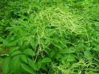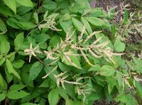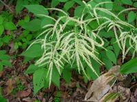 名前の由来 ショウマの仲間で、山に生えることから。 特 徴 葉は2回3出複葉で9枚の小葉からなる。小葉は卵形で先はとがる。茎の上部に円錐状に総状花序を作り、黄白色の小さな5弁の花をつける。雌雄異株の多年草。