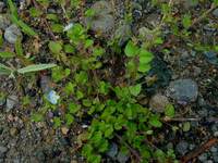 特 徴 茎は地上部を這って伸びる。葉は卵形で鋸歯があり、下部では対生し、上部では互生。花は青く、紫色の筋がある。花びらが4弁に見える合弁花、葉全面に出て咲く。