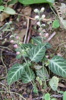 特 徴:葉は卵状の三角形で裏面は紫色、縁には粗い鋸歯があり、対生。花は茎先に穂状につき、唇形でたくさんつけ、つけ根の部分で垂直に曲がり立ち上がる。青紫色。