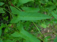 特 徴:つる性。葉はほこ形で先端は尖り基部は耳のように横に張りだす。花は葉腋からでた花柄に1個つける。柄には縮れた狭い翼があり、蕚の下に大きな苞葉がある。花の色は淡紅色。