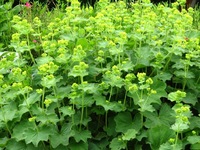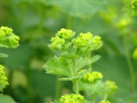 名前の由来:葉を広げると女性のマントに似ていることから。英名「レディス・マントル」を直訳したもの。 特 徴:葉は円心形で手のひら状に7~9浅く裂け、裂片には鋸歯がある。花は小さく房状に咲く。黄緑色