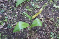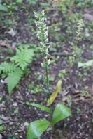 名前の由来: 特 徴:茎に稜がある。葉は根元付近で大きく長楕円形では光沢がある。花は穂状、唇弁は広線形、距は細長く下方に曲がる。色は淡緑白。