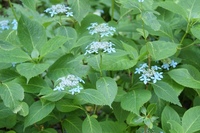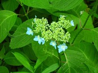 特 徴:落葉低木。根元の株から多数の茎が出て株になる。葉は楕円形で先がとがり、粗い鋸歯がある。青い花のように見えるのは4枚のがく片で飾り花、中心部には5枚の花弁があるのは両性化。色には青色系と赤色系がある。