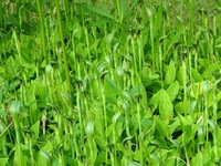 特 徴:葉は長い柄があり、3枚の小葉からなる複葉で、小葉は長い楕円形で先端は尖る。葉柄の中ほどにはムカゴをつける。花茎は葉より高く伸び、その先端に筒状で上部が開いた緑色の仏炎苞をつける。花序の先端は付属体となって長く仏縁苞の外に伸びる。