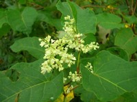 特 徴 茎は太く、中空。葉は大きく、広卵形で互生し、裏面は粉をふいたように白い。茎先や上部の葉の脇に円錐形にたくさんの花をつける。雄花は上向きにつき、雌花は垂れ下がる。