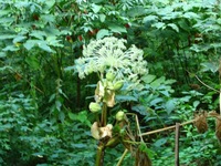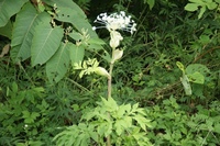 特 徴 茎葉は中空、上部で分枝し、葉は2~3回3出複葉で小葉はさらに羽状に裂ける。 茎柄の基部は大きく膨らむ。 茎先の大きな複散形花序に無数の白い小さな花つける。花弁数は5枚。