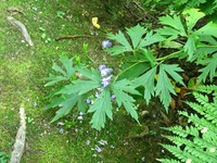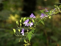 特 徴 茎は弓なりに曲がり、上部で枝分かれする。葉は3個に全裂し、小葉はさらに2深裂する。茎先や葉の付け根から伸びる花序に紫青色の花をつける。