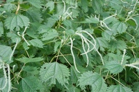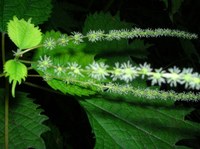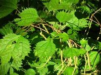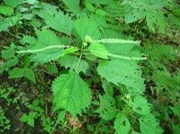 特 徴:茎は分枝せず、茎葉柄ともに赤みを帯びる。葉は卵円形で3葉脈が目立ち先が三つに深裂し、中央の裂片が長く伸び粗い鋸歯があり、対生する。花は上部の茎の葉腋に長い尾状の雌花序を下部の葉腋には雄花序がつく、小さく目立ない。